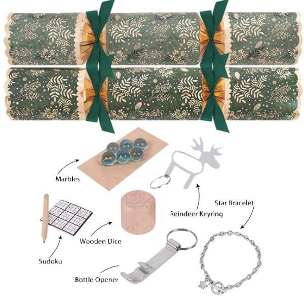 Measuring approximately 35cm in size, these deluxe crackers are larger than standard, ensuring a grand and impressive presence on any holiday table. Each cracker is filled with traditional festive fun, including various gifts (such as marbles, a Sudoku puzzle, wooden dice, a reindeer keyring, a bottle opener, and a star bracelet), a classic party hat, an amusing motto, and a snap for that satisfying pop.