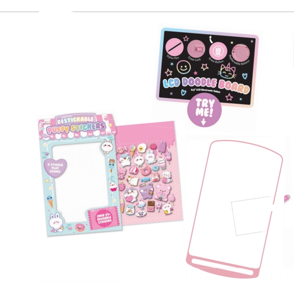 ? 1 x LCD Drawing Pad and Stylus Pen: A vibrant, easy-to-use LCD drawing pad featuring a bold black screen and a colourful border adorned with charming creature illustrations. The included stylus pen allows for smooth, mess-free drawing, writing, and doodling simply press a button to erase and start fresh!