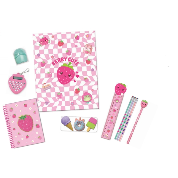 ? 1 x Themed Folder: A vibrant folder featuring adorable strawberry characters and the cheerful message “So Berry Cute!”, ideal for organizing papers and homework.