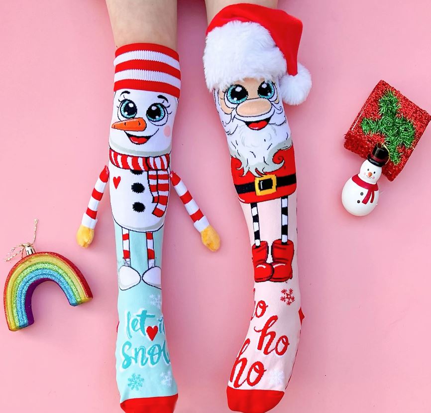 Step into the holiday spirit with the playful and festive MADMIA Santa & Snowman 3D Christmas Socks! These unique socks are designed to bring a smile to anyone’s face, featuring bold colors and adorable Christmas characters. One sock showcases a cheerful snowman with a 3D striped scarf and cute carrot nose, while the other features a happy Santa with a soft, plush hat and beard.